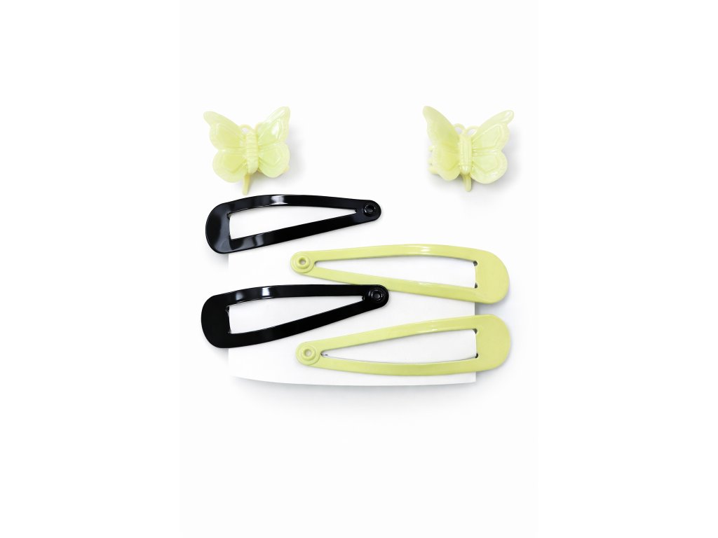 Svěží zelené odstíny v kombinaci s černými prvky vytváří výrazný, ale stále hravý vzhled. Motýlky dodávají balíčku jemnost a dětskou radost. Sponky jsou lehké, pevné a vhodné pro různé typy účesů.