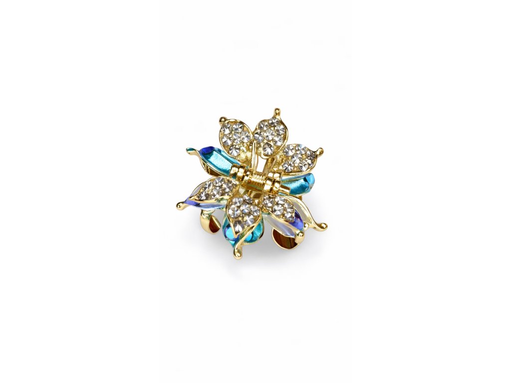 Luxusní skřipec zdobený motýlkovým motivem a lesklými kamínky dodá účesu okamžitý šmrnc. Zlatý základ v kombinaci s barevnými detaily působí slavnostně a výrazně. Ideální doplněk pro speciální příležitosti i chvíle, kdy chcete zazářit.