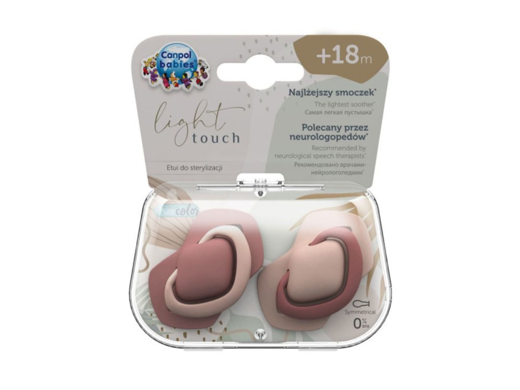 Dudlíky Light touch jsou malé a lehké - jedná se o nejlehčí dudlíky z nabídky od značky Canpol babies. Jsou určeny pro děti v různých velikostech, neobsahují BPA a v balení, v podobě sterilizační kapsle, jsou umístěny 2 ks dudlíků.