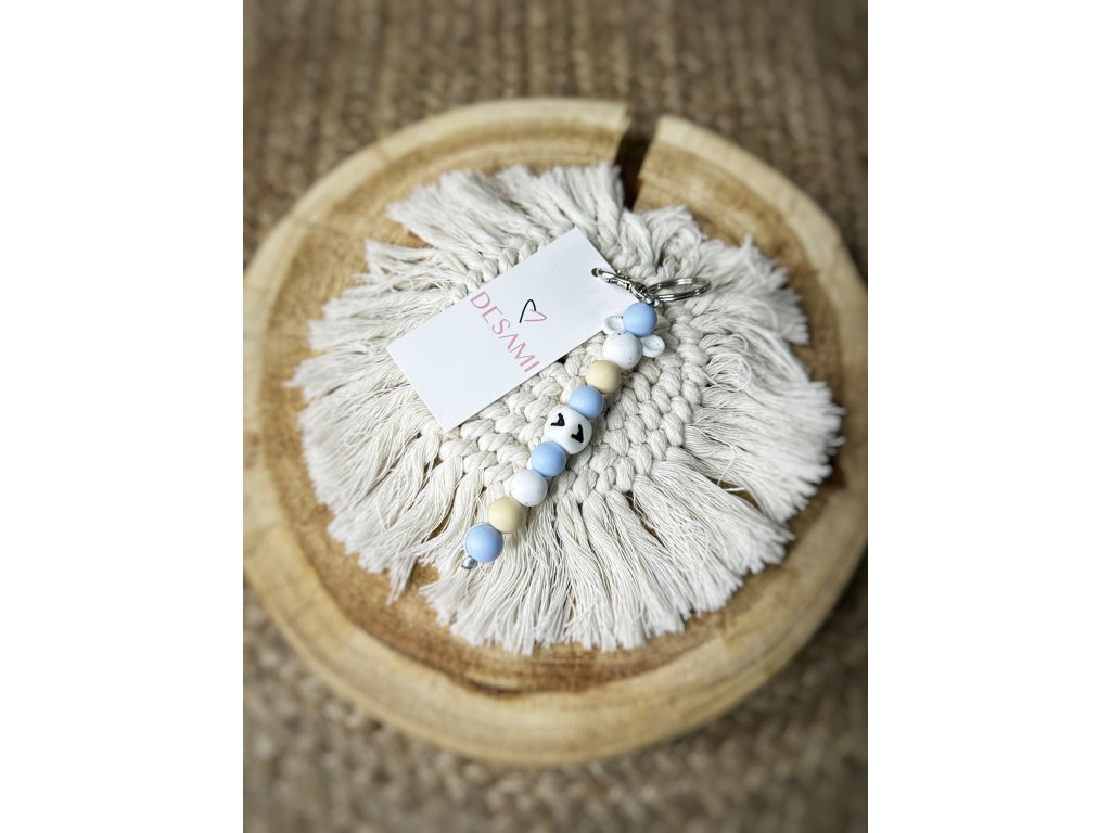 Barevná kombinace světle modrých, krémových a jemně šedých korálků působí klidně. Výraznějším detailem jsou mramorové korálky s drobnými tečkami. Hravým prvkem je korálek s motivem Mickey, který celému přívěsku dodává veselý charakter.
