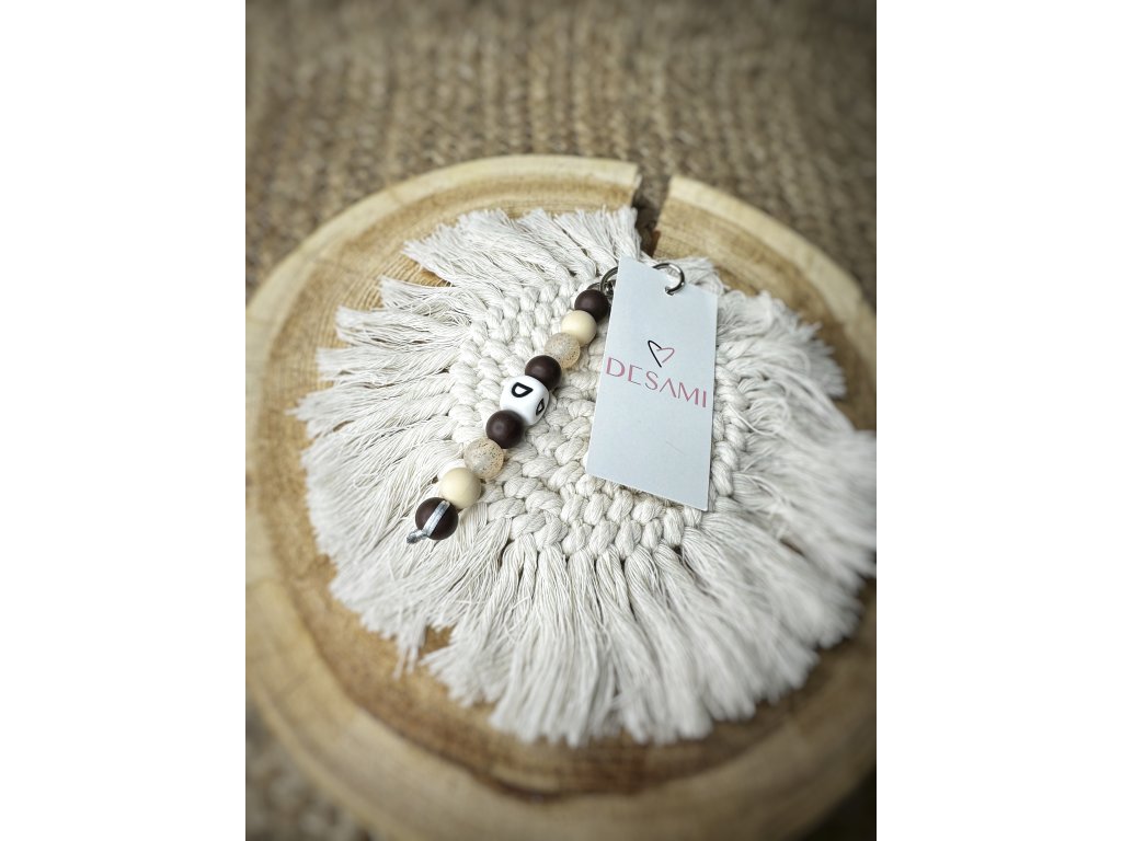 Přívěsek je doplněn korálky v krémových a hnědých odstínech, které působí klidně, přirozeně a nadčasově. Barevná kombinace dodává přívěsku lehkou hravost a jemný vizuální akcent, aniž by působila výrazně nebo rušivě.