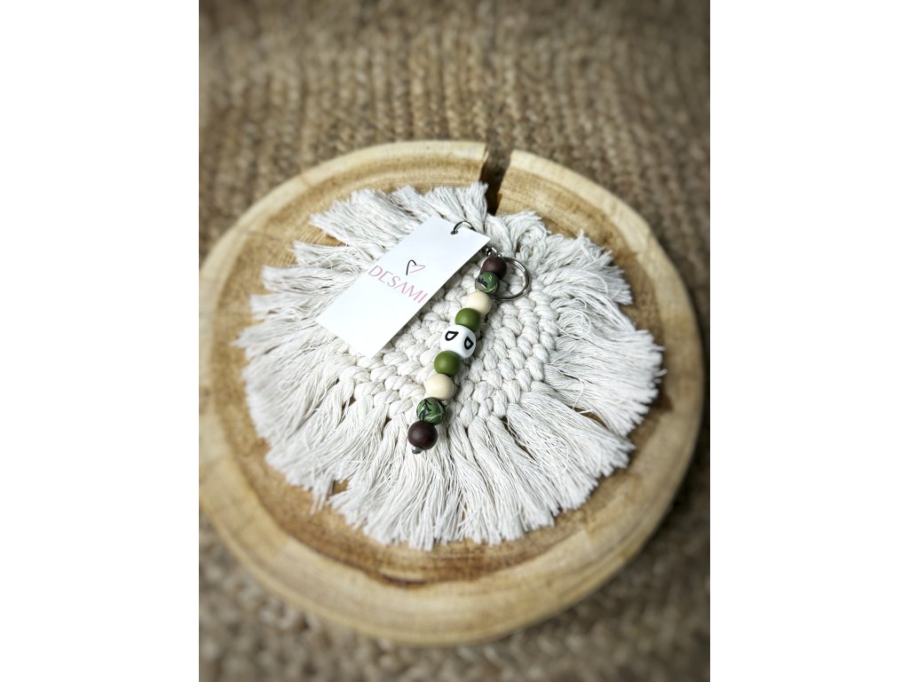 Kombinace zelených, krémových a hnědých korálků působí zemitě, harmonicky a nadčasově. Barevné ladění evokuje klid a ticho lesa, stabilitu a přirozenost, zatímco drobné detaily dodávají přívěsku jemnou hravost a originalitu.