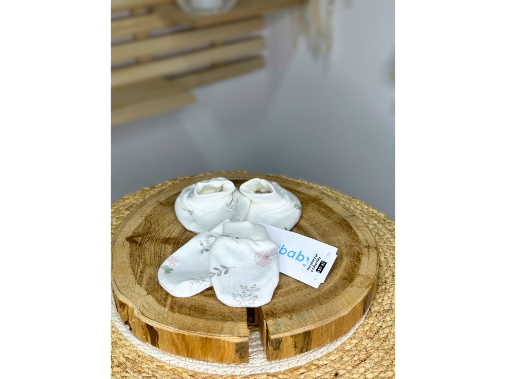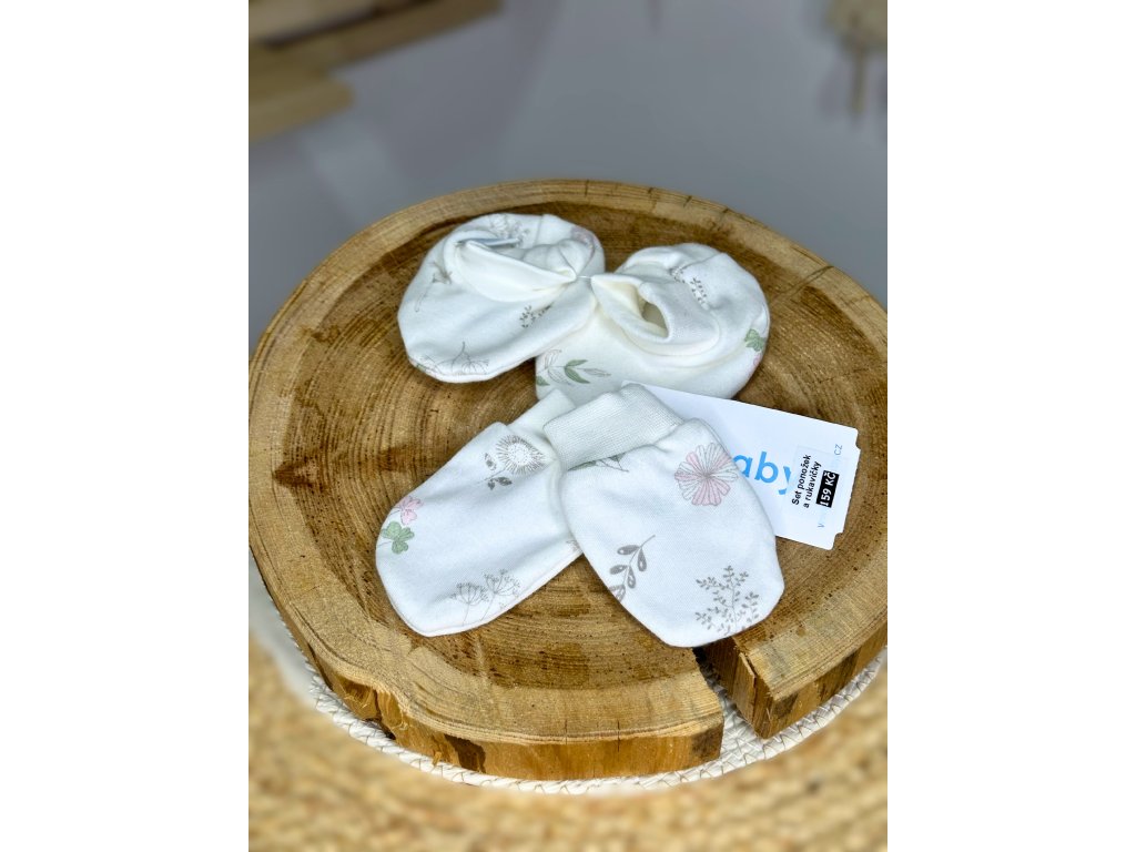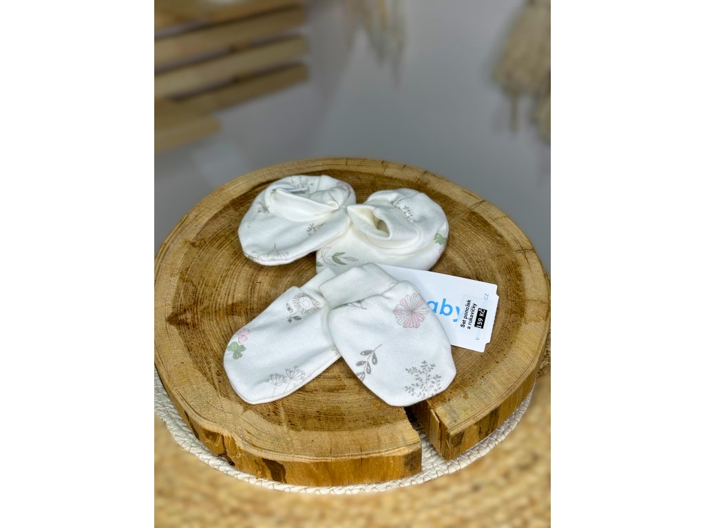 Krásný a praktický bavlněný set české značky New Baby Zoe. Set se skládá z capáček a rukaviček. Capáčky a rukavičky jsou zdobeny potiskem květin a mají stahovací manžetky. Složení: 100% bavlna.